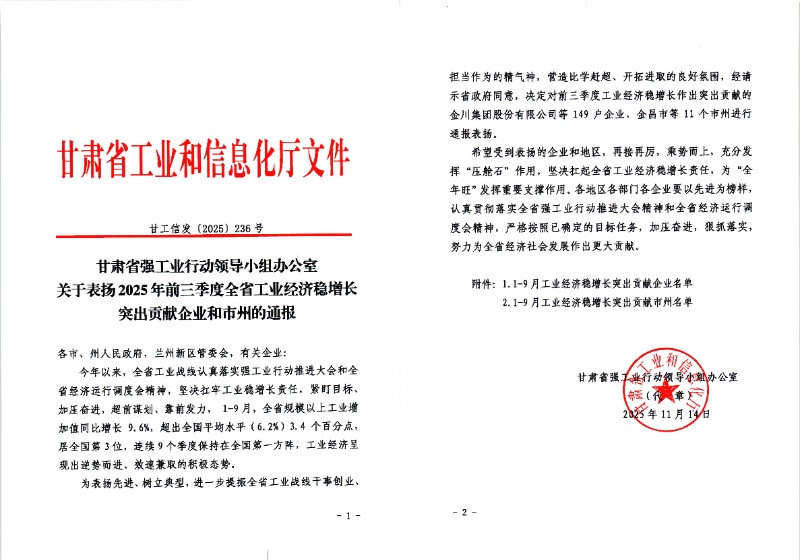 近日,甘肃省强工业行动领导小组办公室印发《关于表扬2025年前三季度全省工业经济稳增长突出贡献企业和市州的通报》(甘工信发〔2025〕236号),对前三季度工业经济稳增长作出突出贡献的企业进行通报表扬,甘肃建投新能源公司凭借强劲发展韧性、扎实产业贡献与亮眼增长业绩获得表扬。