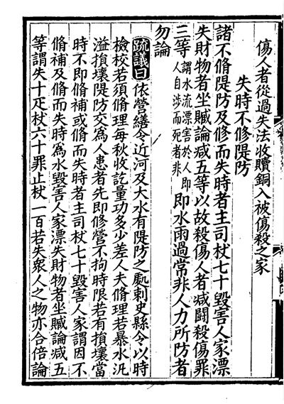 《唐律疏议》是中国历史上迄今保存下来的最完整、最早的古代成文法典。其《杂律》第424条规定:“诸不修堤防及修而失时者,主司杖七十”“诸盗决堤防者,杖一百”“其故决堤防者,徒三年”,将不修堤防、盗决堤防列入法定罪行。